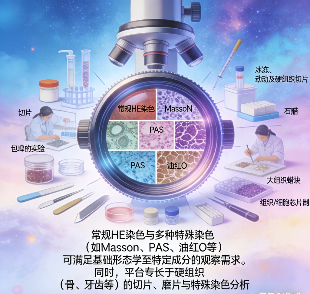 我们的平台可处理各类生物样本,提供石蜡、冰冻、振动及硬组织切片服务,并具备大组织蜡块、组织/细胞芯片等特殊包埋能力。常规HE染色与多种特殊染色(如Masson、PAS、油红O等)可满足基础形态学至特定成分的观察需求。同时,平台专长于硬组织(骨、牙齿等)的切片、磨片与特殊染色分析。